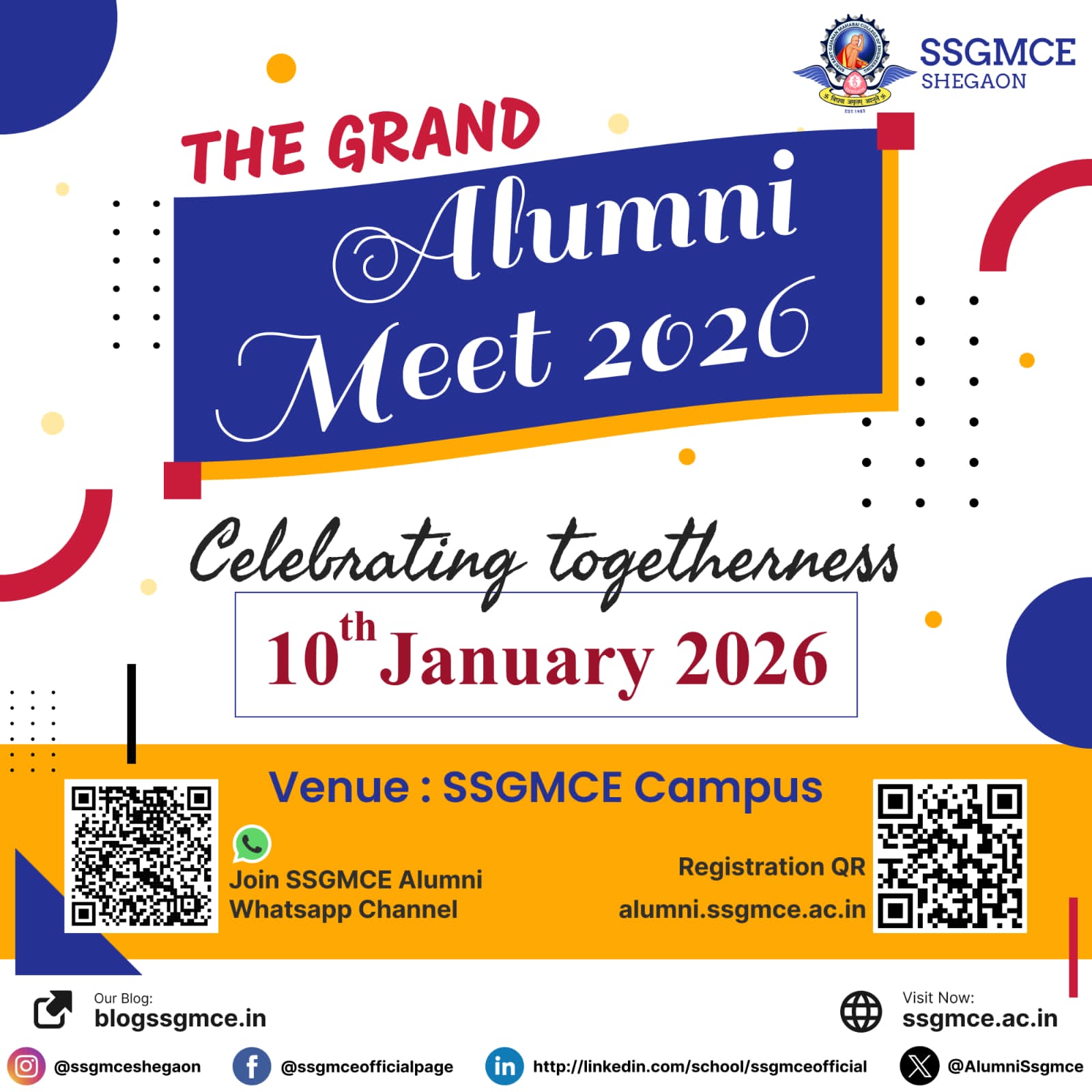 We are thrilled to invite you to the GRAND ALUMNI MEET on Saturday, January 10, 2026 at SSGMCE Campus.