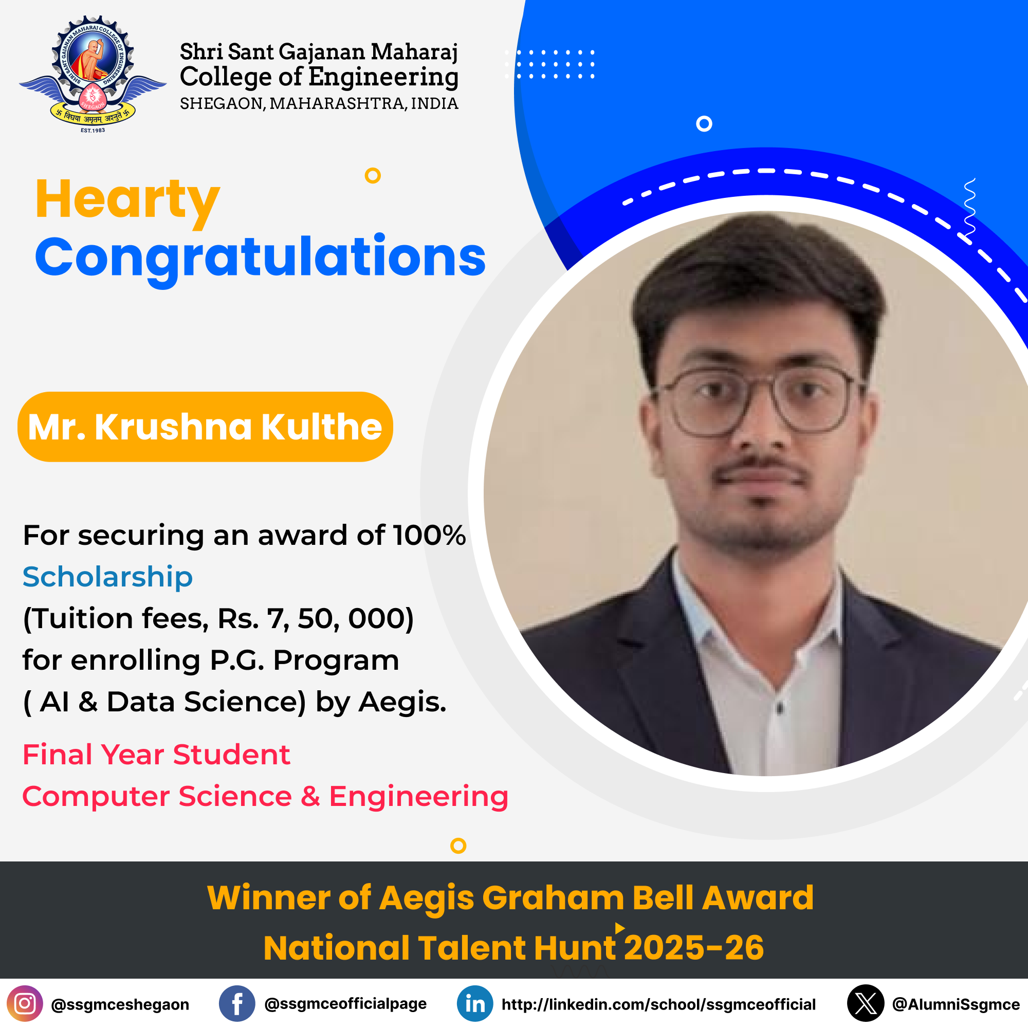 We are proud to share that Mr. Krushna Kulthe, Final Year CSE student of SSGMCE, Shegaon, has secured a 100% Scholarship (β‚Ή7,50,000 – full tuition fees) for enrolling in the Post Graduate Program in AI & Data Science by Aegis.